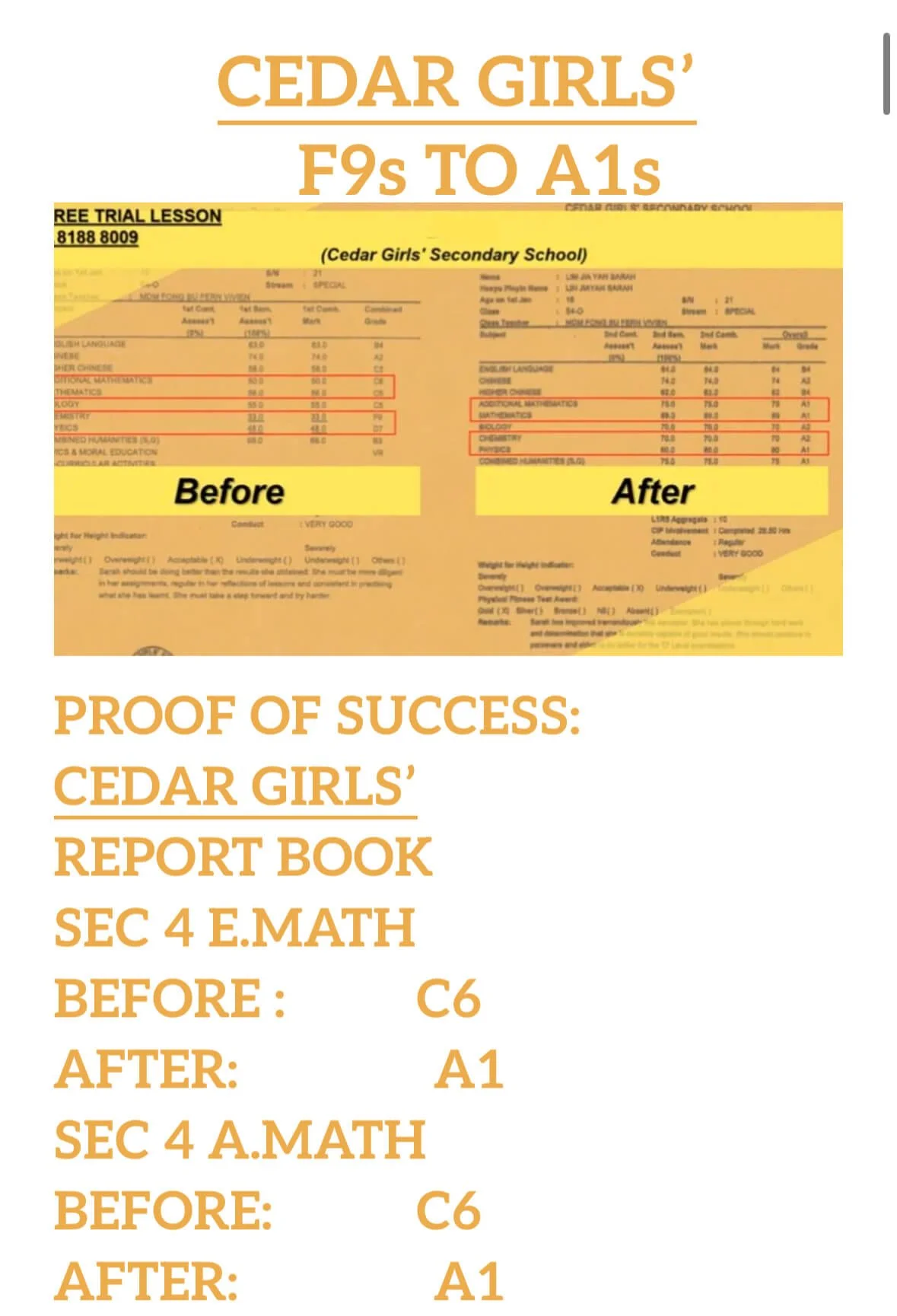 F9 TO A1 ACADEMY has been officially the BEST SEC 4 MATH TUITION IN SINGAPORE since 2004 when it became the one & only math tuition centre to publish A1 O LEVEL A.MATH & O LEVEL E.MATH RESULTS & BEST IN MATH AWARD from one of the most popular schools, St. Nicholas Girls’ School, in Singapore as recent as 2023.The results shown above is from one of the most prestigious & popular school in Singapore: CEDAR GIRLS’ SECONDARY SCHOOL.