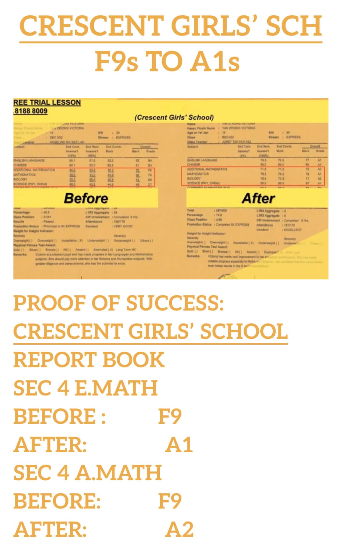 The BEST SEC 4 MATH TUITION, F9 TO A1 ACADEMY, has been officially the BEST SEC 4 MATH TUITION IN SINGAPORE since 2004 when it became the one & only SEC 4 MATH TUITION to publish A1 O LEVEL MATH RESULTS & IMPROVEMENT FROM F9 TO A1 GRADES IN O LEVEL A.MATH & O LEVEL E.MATH every year from 2004-2023. Shown above is the F9 TO A1 SEC 4 MATH RESULTS derived from the report book of our student from CRESCENT GIRLS’ SCHOOL.