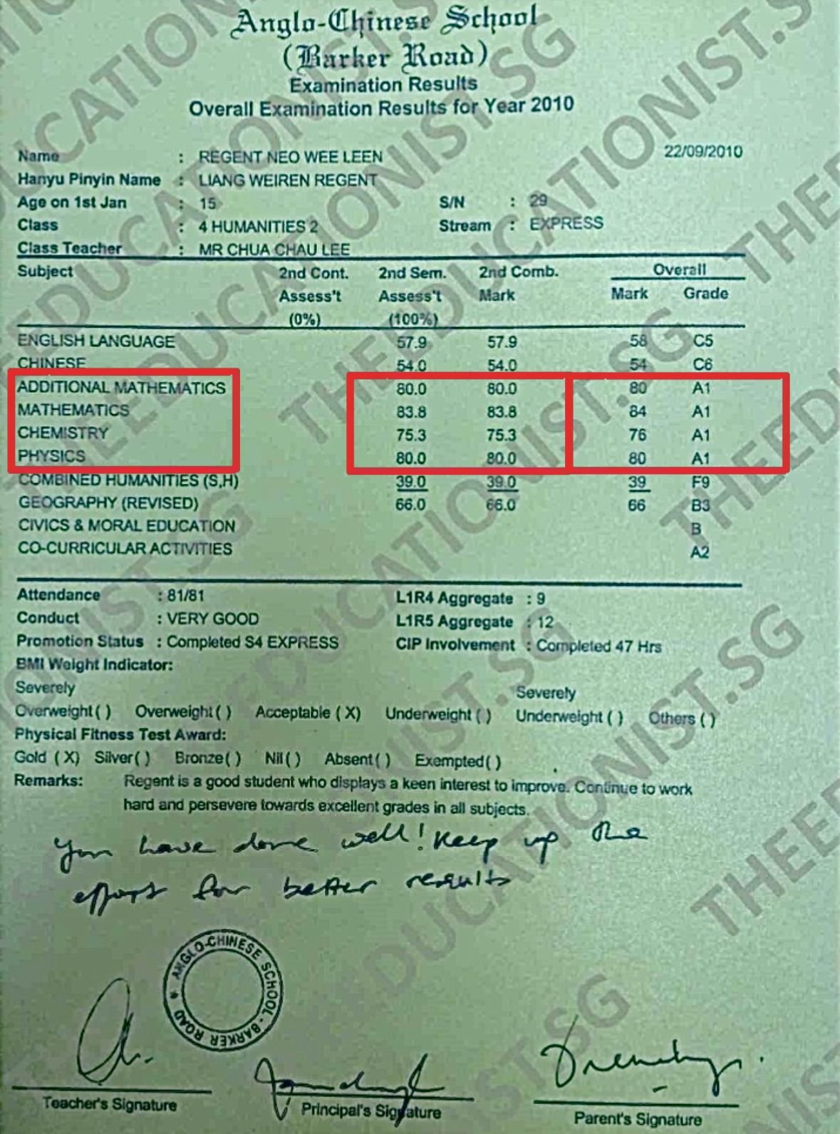 NELSON LEOW HELPED REGENT ACHIEVED 4A1s ULTIMATELY in A.MATHS, E.MATHS, CHEMISTRY & PHYSICS FOR SEC 4 PRELIMS, as clearly exhibited in his Sec 4 ACS Prelim Results below.