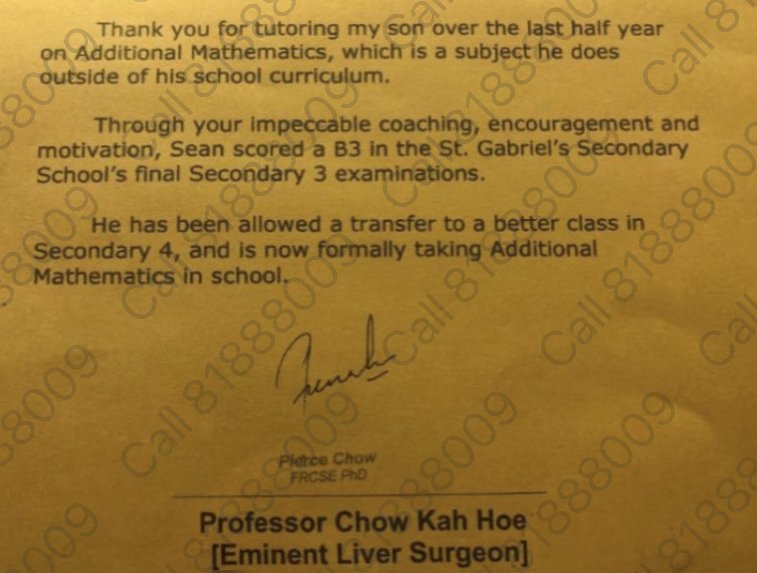 In conducting his Sec 4 maths Tuition, BEST SEC 4 MATH TUTOR SINGAPORE, NELSON LEOW also points out to students what the Cambridge examiners are looking out for. In addition to this, he also teaches students the proper way to decipher and answer directly to the question, which is the main problem that majority of students face. BEST SEC 4 MATH TUTOR SINGAPORE, NELSON LEOW proved himself to be a Good Maths Tuition Teacher who is able to address the root cause of students not scoring well. By the first test after joining, students will see an improvement just solely by learning the right techniques to answering maths questions.